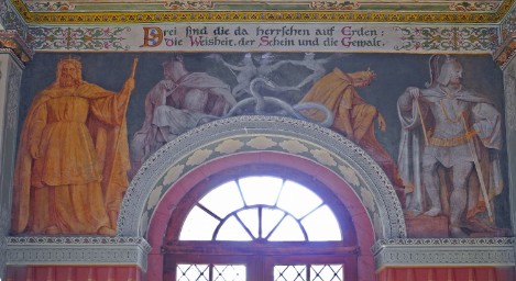 Der Saal umfasst neben der auf Semper zurückgehenden Deckenmalerei und Ornamentik insgesamt 6 Fresken nach Goethedichtungen.