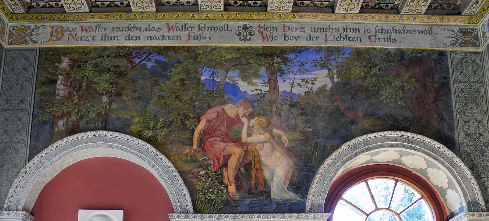 Der Fischer in Gestalt eines Jünglings im roten Gewande sitzt gedankenversunken am Ufer eines auf- und abschwellenden Baches. Die Fluten teilen sich und ihnen entsteigt eine blonde, langhaarige Nixe, die den Jüngling verlockend und verführerisch ansieht. Liebevoll, schüchtern, aber herausfordernd streicht sie mit der linken Hand sein Kinn. Sie fragt ihn, warum er Jagd auf Ihresgleichen macht und erzählt und singt ihm von der Schönheit ihrer Unterwasserwelt. Der Fischer verfällt ihrem Gesang und folgt der Nixe in die Tiefe, woraufhin er von keiner Menschenseele mehr gesehen wird. Text und das daraus entstandene Fresko zeigen die Schönheit der Natur, das Verführerische und Mystische dieser Welt.