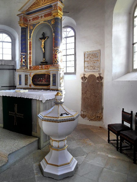 Zur Ausstattung gehören ein schlichter klassizistischer Altar von 1843, eine Kanzel mit gemalten Darstellungen von Petrus, Christus und Paulus am Korb aus der Mitte des 17. Jahrhunderts und eine Taufe aus dem Jahr 1859, sämtlich aus Holz. Verschiedene Grabmale derer von Kiesewetter sind weiter zu erwähnen. In der Patronatsloge an der Nordseite steht ein figürlicher Grabstein für Christian von Kiesewetter († 1643), hinter dem Altar für Otto von Kiesewetter († 1647) und Christoph von Kiesewetter († 1742). Am selben Ort sind zwei geschnitzte Wappen derer von Kiesewetter aus dem Jahr 1662 erhalten. Im Turm sind drei einfache Gemälde mit einer Darstellung von Susanne Maria von Kiesewetter († 1647), einem Bildnis eines Pfarrers aus der Mitte des 17. Jahrhunderts und der Darstellung aus dem Jophannesevangelium (18. Jahrhundert) zu finden (Quelle: WIKIPEDIA)